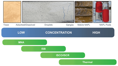 In many cases, the best solution for a site is to combine technologies spatially and/or temporally. Choosing the best technology at the right time and place for each zone (e.g., source zone vs. dissolved phase plume) or stage of the project represents the most cost-effective and efficient approach.