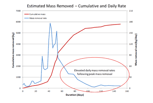 Slowly declining asymptotic daily mass removal rates may also be used in an evaluation of whether diminishing returns have been achieved. In some instances, once declining mass removal rates have been observed, we may evaluate the weekly reduction in soil concentrations based on current mass removal rates and soil volume in the treatment area. By quantifying the weekly reduction in contaminant mass, the assessment of whether diminishing returns have been achieved is often clearer and can help guide conversations with stakeholders on whether the shutdown of the thermal treatment is warranted favorable.