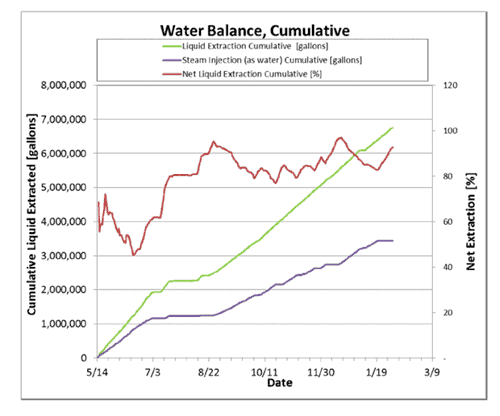 Maintaining a solid site water balance is a little more involved. The water balance kept during the operations of an ISTR project tracks the net injection and extraction of fluids, such that an overall net removal is maintained. The water balance is an important parameter for all thermal remedies, but it is especially important at sites that use electrical resistance heating (ERH) and steam enhanced extraction (SEE) technologies where a sizable quantity of water is injected as cooling and wetting fluid to electrodes (ERH) or as steam (SEE).