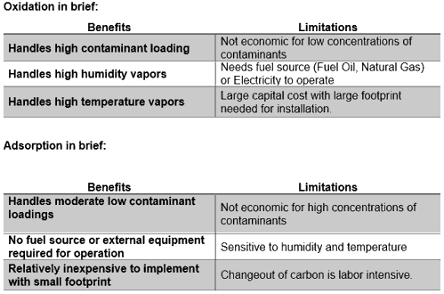 Once the moisture is removed, the COC can now be dealt with more readily. The remediation choices at this stage are oxidation and absorption. For large COC loadings, oxidation is the obvious choice, as the cost to continually change out spent adsorbent is prohibitive. That said, oxidizers should always have an adsorbent as a backup treatment method should the oxidizer need to be taken offline for any reason.