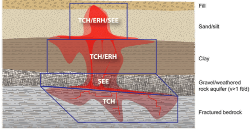 Looking a little closer at SEE, the important design factor is hydraulic conductivity. If the soil is not conductive enough, then the steam cannot migrate through the site sufficiently and/or uniformly and will fail to adequately heat the targeted treatment area. For SEE, the effective porosity and hydraulic conductivity of most fractured rock sites are too low and for ERH the electrical resistance is too high for effective heating. Fractured rock tends to have a thermal conductivity between 1 and 7 Wm-1K-1, which is ideal for TCH.