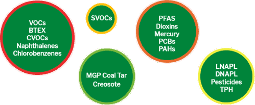 Thermal remediation technologies can be used to treat a wide variety of chemicals. TerraTherm most commonly treats sites contaminated with volatile organic compounds (VOCs) and semi-volatile organic compounds (SVOCs); however, we have also treated sites contaminated with total petroleum hydrocarbons (TPH), manufactured gas plant (MGP) coal tar, creosote, dioxins, polychlorinated biphenyls (PCBs), polycyclic aromatic hydrocarbons (PAHs), mercury, etc. Because of the robust nature of thermal technologies, we have the ability to target a large range of contaminants with different boiling points, molecular weights, densities, and solubilities.
