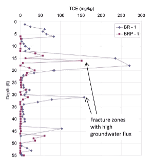 Water flowed rapidly in fractures at depths of 17 and 31 feet. where the TCE reduction was modest. We believe that the cold groundwater flow kept the temperature low enough that the TCE could not be boiled and removed from the matrix in those locations. In contrast, TCE concentrations in the matrix blocks away from the fractures were reduced to modest levels.