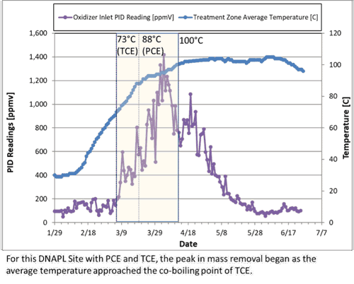 For sites with contaminants in the non-aqueous phase or present as a NAPL, the boiling point of a liquid mixture (i.e., PCE and water) is different than the pure phase boiling point. Without going into the details of summing partial pressures, know that this phenomenon can effectively lower the temperature at which volatilization occurs. Continuing with our example, for a mixture of PCE (BP = 121°C) and water (BP = 100°C), the co-boiling point is 88.5°C. You may have heard other terms like eutectic boiling point, azeotropic boiling point. As a real-world check, when thermally treating source zones with NAPL, the peak of mass recovery often corresponds to the co-boiling point of a mixture of water and the dominant site COCs.