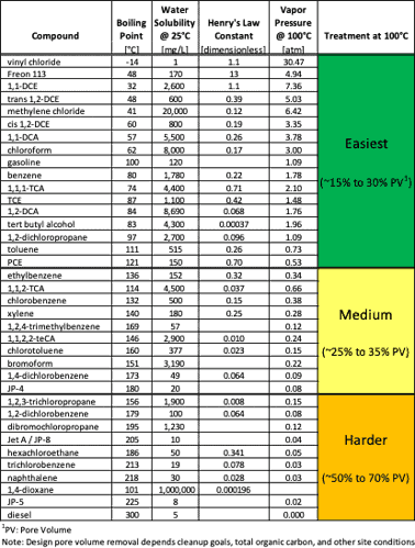 Below is a simplified list of compounds grouped into categories that describes how easily they are recovered at boiling temperatures. This is an empirical list based on our experience treating complex mixtures of contaminants in various geologies. However, this helps describe how temperature affects vapor pressure and how solubility combined with a compound’s pure phase boiling point can be an indicator of its recoverability. From a design standpoint, the easier VOCs may require less steam stripping or a lower percentage of pore volume boil-off compared to more challenging VOCs.